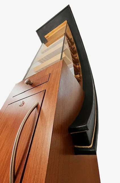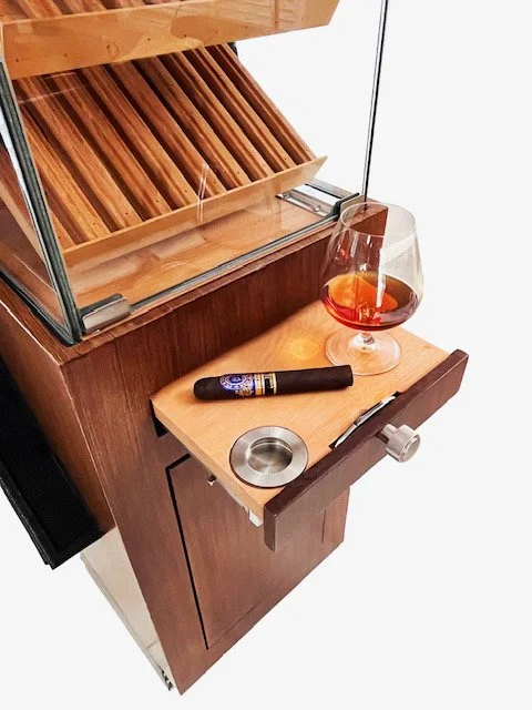 Five Spanish Cedar cigar racks with LED light bars illuminate the climate-controlled glass basin atop a Wenge veneered base cabinet with leather interior & storage rack for additional cigar storage capacity (unconditioned) or liquor storage. The ducted humidifier in the rear of the unit provides access to the reservoir & filter sitting on stainless steel trim, representing coils of the snake.